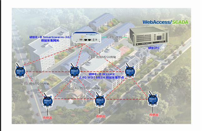 環(huán)境監(jiān)控研華物聯(lián)網(wǎng)無線數(shù)據(jù)采集解決方案,輕松掌控大型廠區(qū)環(huán)境監(jiān)測應用地區(qū): 大型廠區(qū) 應用產(chǎn)品: Smartswarm-342 網(wǎng)關、Wzzard 2.4G WIFI MESH數(shù)據(jù)采集節(jié)點、研華IPC、WebAccess/SCADA 項目背景面臨挑戰(zhàn)1. 需要采用無線傳輸 2. 能連接4~20mA, 0~5V傳感器 3. IP67防護等級 4. 工業(yè)級寬溫設計 客戶廠區(qū)面積大且監(jiān)控設備分散,傳統(tǒng)的WIFI產(chǎn)品因傳輸距離問題,可能無法提供好的解決方法,另外一個問題,由于客戶的設備分散,并非每個位置都能擁有好的供電來源,如果使用標準的WIFI采集模塊,供電選擇上很有可能會出現(xiàn)問題。因此最后我們在客戶的需求點上,新增兩個: 1. 低功耗產(chǎn)品,能支持電池安裝與外接電源,或使用太陽能板供電。 2. 能支持自組網(wǎng) 和客戶溝通確認需求之后,我們推薦客戶使用研華B+B Wzzard數(shù)據(jù)感知平臺,以及WebAccess/SCADA作為整體方案的主要內(nèi)容。 方案設計1. Smartswarm-342 網(wǎng)關 2. Wzzard 2.4G WIFI MESH數(shù)據(jù)采集節(jié)點 Smartswarm-342網(wǎng)關: