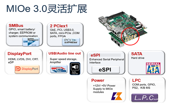 MIOe擴展接口是研華自主推行的擴展接口標準,高度集成的設(shè)計能夠節(jié)約20%的系統(tǒng)空間。MIOe 3.0包含了如下常用的功能信號,客戶可在擴展底板上直接使用,從而可將精力投入產(chǎn)品核心功能的開發(fā),大大加速了客戶創(chuàng)新產(chǎn)品上市。