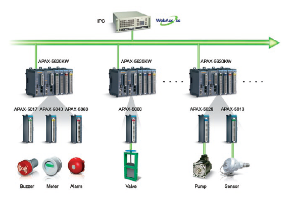 ▌▌系統(tǒng)總覽: 為了滿足Easy Control Technology的要求,研華為APAX-5620KW可編程自動(dòng)化控制器(PAC)提供了各種APAX數(shù)字和模擬I / O模塊(包括APAX-5040,APAX-5060,APAX-5017和APAX- 5028),以建立一個(gè)冗余的系統(tǒng)架構(gòu)來監(jiān)控電閘和除砂設(shè)備。相同的配置還用于監(jiān)視電源系統(tǒng)中的發(fā)電機(jī)和配電面板。五個(gè)帶有APAX-5013 8通道RTD模塊的APAX產(chǎn)品可采集數(shù)據(jù)并控制泵,壓力,水位,流量,電動(dòng)蝶閥等。對(duì)于這三個(gè)區(qū)域的數(shù)據(jù)采集和現(xiàn)場(chǎng)控制,核心是APAX- 5620KW控制器。其雙CPU模塊架構(gòu)獨(dú)立運(yùn)行,可提供高性能計(jì)算并執(zhí)行輸入和輸出控制任務(wù)。此外,冗余機(jī)制將I / O處理程序存儲(chǔ)在兩個(gè)獨(dú)立系統(tǒng)中的兩個(gè)控制器上。主控制器執(zhí)行I / O操作,當(dāng)主控制器發(fā)生故障時(shí),備用控制器將自動(dòng)快速接管。這種獨(dú)特的雙控制器架構(gòu)為穩(wěn)定且不間斷的應(yīng)用提供了出色的可靠性。在建筑物的中央控制室中安裝了ATX主板AIMB-781,可機(jī)架安裝的ACP-4000機(jī)箱和研華WebAccess HMI / SCADA軟件。其易于使用的用戶界面為管理人員提供了動(dòng)態(tài)圖形顯示和實(shí)時(shí)數(shù)據(jù)控制?;跒g覽器的軟件還允許地方和中央政府部門隨時(shí)遠(yuǎn)程監(jiān)視水產(chǎn)養(yǎng)殖生產(chǎn)區(qū)的狀況。此外,研華還提供了支持簡(jiǎn)單網(wǎng)絡(luò)管理協(xié)議(SNMP)的EKI-4654R和EKI-7659C工業(yè)級(jí)交換機(jī)。通過這些高性能的以太網(wǎng)交換機(jī),該項(xiàng)目的現(xiàn)場(chǎng)硬件設(shè)備與控制室監(jiān)控系統(tǒng)無縫連接,以確保傳輸質(zhì)量。